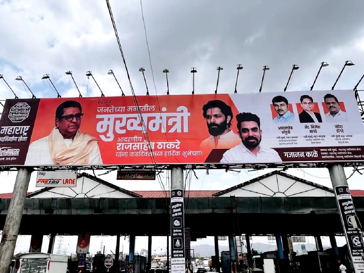 मनसेचे प्रवक्ते तसेच नवी मुंबई मनसेचे अध्यक्ष असलेल्या गजानन काळे यांनी हे होर्डिंग वाशी टोल नाक्यावर लावले आहेत. या होर्डिंगवर भगवा रंग प्राकर्षाने वापरण्यात आला आहे. कपाळावर भगवा टिळा, गळ्यात मफलर घातलेल्या लूकमधील राज ठाकरेंचा फोटो या बॅनरवर दिसत आहे. तसेच राज यांचे पुत्र आणि महाराष्ट्र नवनिर्माण विद्यार्थी सेनेचे अध्यक्ष अमित ठाकरेंचाही फोटो या होर्डिंगवर दिसत आहे. या होर्डिंगवर मुख्यमंत्री हा शब्द अगदी मोठ्या आकारच्या फॉण्टमध्ये लिहिलेला आहे.