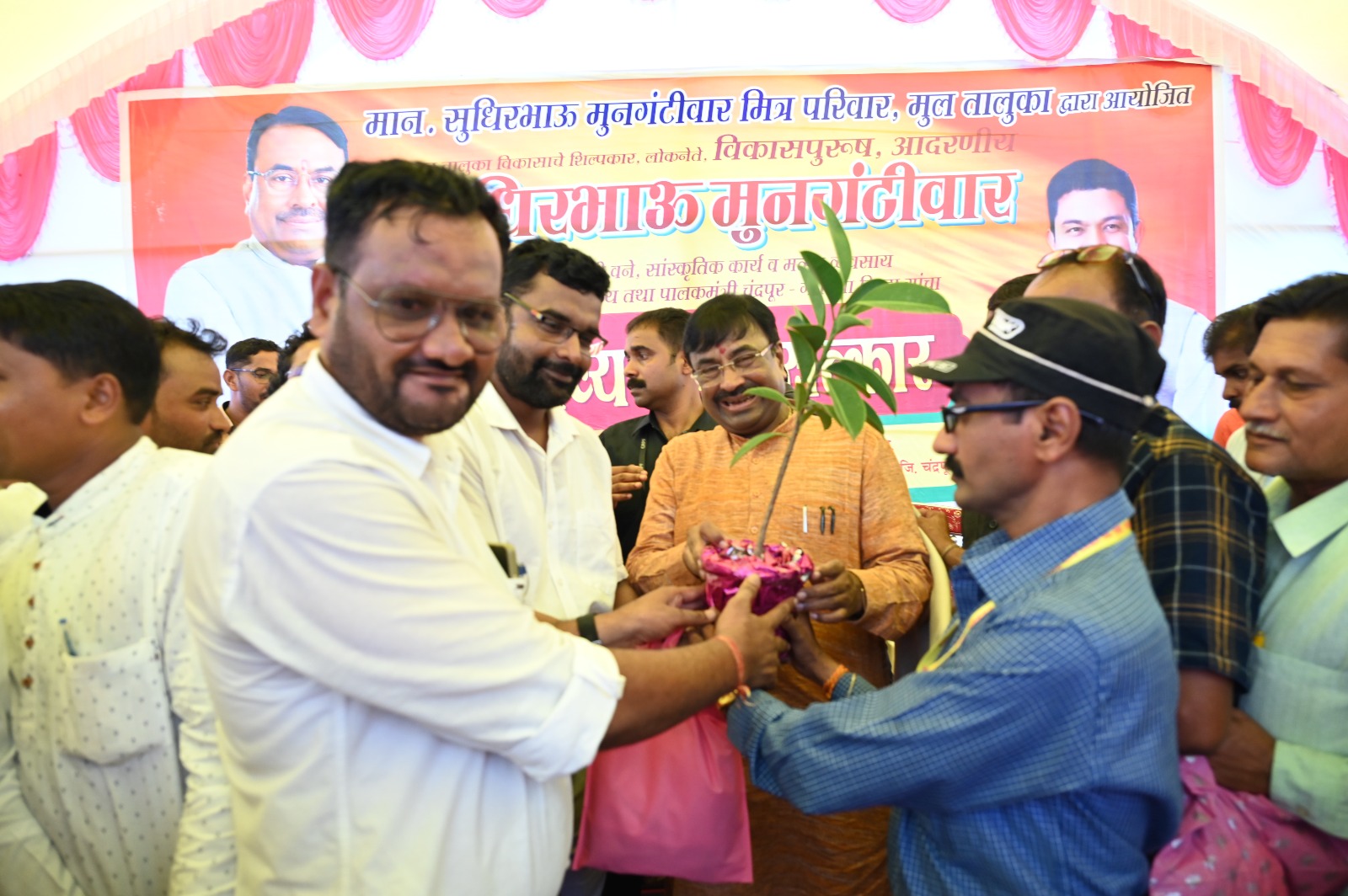 नुकताच मूल येथे ना.मुनगंटीवार मित्रमंडळ व तालुक्यातील अनेक सामाजीक,राजकिय,शैक्षणिक संघटनांतफै भव्य सत्काराचा कार्यक्रम आयोजीत करण्यात आला होता.राज्य पत्रकार संघ तालुका शाखा मूल चे अनेक पदाधिकारी अनुक़मे मनिष रक्षमवार,सतिष राजूरवार,धमैश सुत्रपवार,राजू सुत्रपवार यांनी यावेळी फणसाचे रोपटे व शाल देऊन पालकमंत्री ना.सुधिरभाऊ मुनगंटीवार यांचा सत्कार केला.सदर भेट वनमंत्री यांनी सोबत घेण्याची सुचना आपल्या सहायकांना केली.