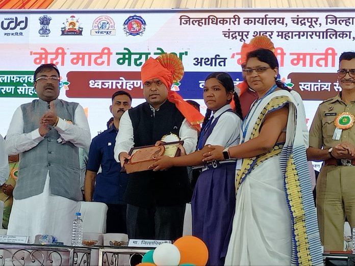 मुल: मेरी माटी मेरा देश’ अंतर्गत जिल्हास्तरीय निबंध स्पर्धेमध्ये, नवभारत विद्यालय मूल येथील विद्यार्थीनी कु.सलोनी भिमदर्शन डोहने हिने प्रथम क्रमांक प्राप्त केल्याबद्दल दि.23/08/2023रोज बुधवारला अब्दुल कलाम गार्डन या स्थळी.मान.श्री.पालकमंत्री,वनमंत्री व संस्कृतीक मंत्री सुधिर मुणगंटीवार यांच्या उपस्थितीत व मान.जिल्हाधिकारी श्री.विनय गौडा यांच्या हस्ते सन्मानचिन्ह देऊन गौरव करण्यात आला.