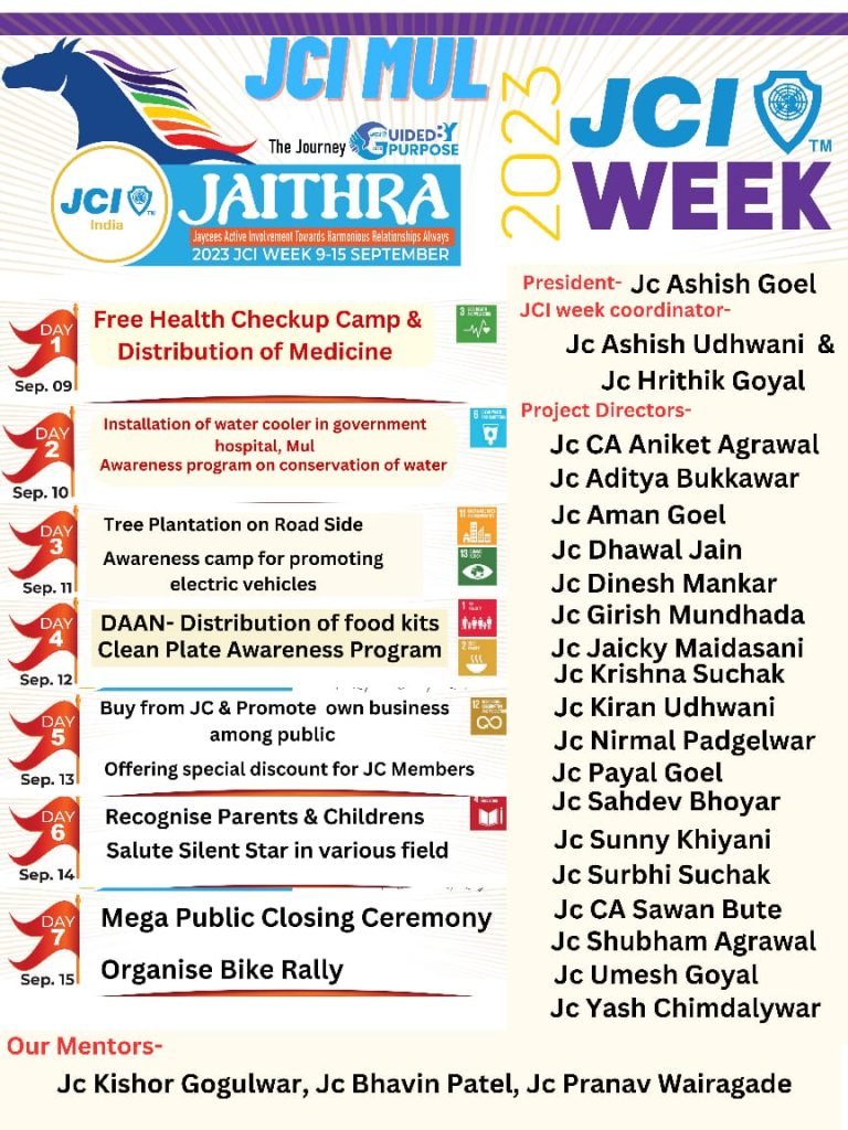 जेसीआई मूल तर्फे जेसीआई सप्ताह यावर्षी मोठ्या थाटामाटात साजरा केला जाणार आहे. 9 ते 15 सप्टेंबर या कालावधीत शहरात विविध सामाजिक कार्यक्रमांचे आयोजन करण्यात आले आहे.