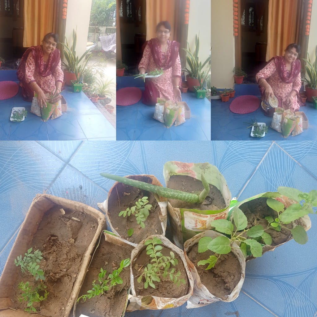 5.दिवाळीनिमित्य टाकाऊ प्लाॅस्टिकग्लास व बॅग मध्ये रोपांचे रोपन.