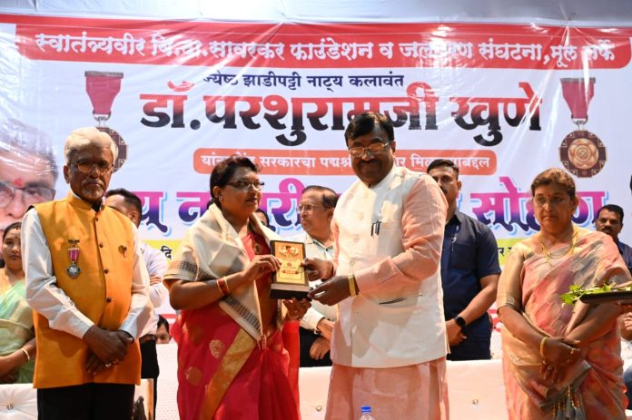 दि.23/07/2023रोज रविवारला स्वातंत्र्यवीर सावरकर फाउंडेशन व जलतरण संघटना यांच्या संयुक्त विद्यमाने आयोजित सत्कार सोहळ्यात नवभारत विद्यालय मूल येथील शिक्षिका पर्यावरण सखी सौ.वर्षा भांडारकर मॅडमला निसर्ग प्रेमी पर्यावरण संवर्धन हा पुरस्कार सन्माननीय पालकमंत्री श्री.सुधीरभाऊ मुनगंटीवार व झाडी बोलीतील जेष्ठ कलावंत पद्मश्री पुरस्कारविजेते श्री.परशुरामजी खुणे यांच्या हस्ते