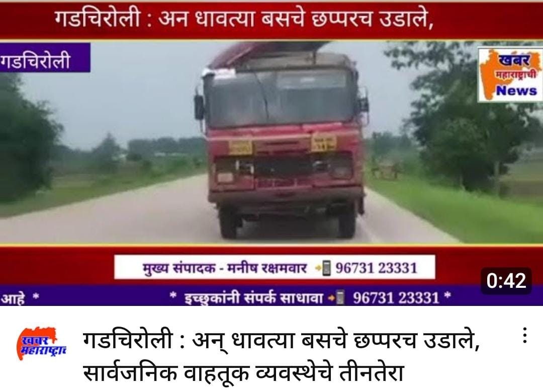 काय होतं व्हिडिओमध्ये?गडचिरोली जिल्ह्यातील अहेरी आगाराची ही बस असून गडचिरोली – अहेरी या मार्गावर धावत असताना या बसचा व्हिडिओ शूट करण्यात आला होता. यामध्ये या बसचे छप्पर उडाल्याचं दिसत होतं. सुदैवाने बसचे छप्पर तुटून अर्ध्यातच अडकल्याने मोठी दुर्घटना टळली.लालपरीची दयनीय अवस्थाअतिमागास अशी ओळख असलेल्या गडचिरोली जिल्ह्यातील शासकीय व्यवस्था दिवसेंदिवस ढासळत चालली आहे. पावसाळ्यात बसमध्ये पाणी गळणे, बस रस्त्यात बंद पडणे हे नित्याचेच झालेले असताना बुधवारी (ता. २६) चालत्या बसचे चक्क छप्परच उडाले. गडचिरोलीवरून अहेरीकडे जात असलेल्या या बसचे छप्पर चामोर्शी मार्गावर उडाले. अर्धवट छप्पर तुटलेल्या अवस्थेतच ही बस काही किलोमीटर तशीच धावत राहिली.