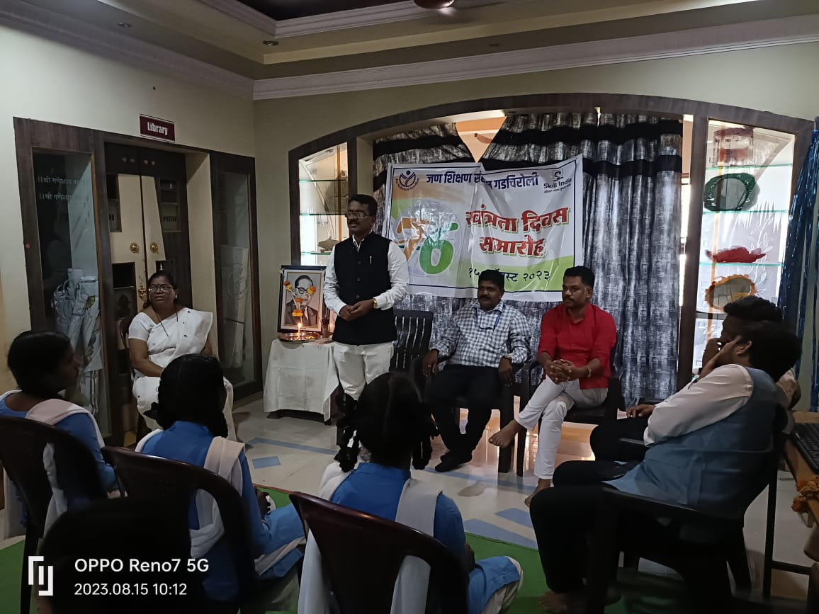 त्यांनातरजन शिक्षणसंस्थानगडचिरोली च्या सभागृहात मार्गदर्शन कार्यक्रमाचे आयोजन करण्यात आले. तसेच विविध कार्यक्रमाचे आयोजन करण्यात आले. केशव चव्हाण कार्यक्रम अधिकारी जन शिक्षण संस्थान गडचिरोली यांनी स्वातंत्र्य चळवळीत शहीद झालेल्या वीर पुरुष्यांच्या योगदान याविषयी मार्गदर्शन केले. यात अनेक विद्यार्थ्यांनी सहभाग घेतला. यात मार्गदर्शन, भाषण, संभाषण, गीते, यासारखे अनेक उपक्रम राबविण्यात आले. सदारच्या कार्यक्रमाचे संचालन श्रीमती यामिनी मातेरे क्षेत्र सहाय्यक व सहलिपिक यांनी केलेव आभार प्रदर्शन. देवेंद्र तुमसरे सहाय्यककार्यक्रम अधिकारी यांनी केले. या कार्यक्रमाच्या यशस्वीतेकरिता जय शिवहारे लेखाप्रमुख, व दिवाकर मोहूले वप्रशिक्षकांनी मोलाचे सहकार्य केले.
