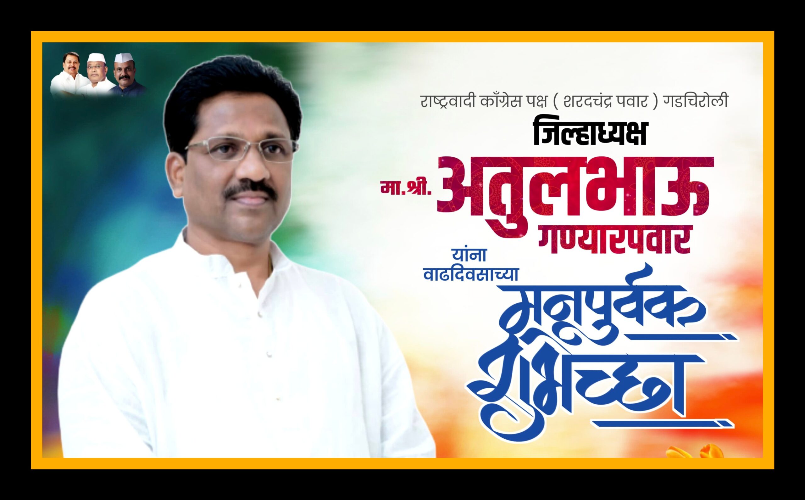 HomeUncategorizedराष्ट्रवादी काँग्रेसचे (शरदचंद्र पवार) जिल्हाध्यक्ष तथा प्रखर नेतृत्व… मा. अतुलभाऊ गण्यारपवार आपणास... Uncategorized राष्ट्रवादी काँग्रेसचे (शरदचंद्र पवार) जिल्हाध्यक्ष तथा प्रखर नेतृत्व… मा. अतुलभाऊ गण्यारपवार आपणास जन्म दिनाचा खूप खूप शुभेच्छा… By Manish rakshamwar August 31, 2025 110 Share FacebookTwitterPinterestWhatsApp {"remix_data":[],"remix_entry_point":"challenges","source_tags":[],"origin":"unknown","total_draw_time":0,"total_draw_actions":0,"layers_used":0,"brushes_used":0,"photos_added":0,"total_editor_actions":{},"tools_used":{"border":1},"is_sticker":false,"edited_since_last_sticker_save":true,"containsFTESticker":false} Share FacebookTwitterPinterestWhatsApp Previous articleसनातन संस्था न्यासातर्फे खाऊ वाटप उपक्रम संपन्न.Next articleआदिवासी गावातील समस्यांची माहिती संकलित केली जाणार..आदि कर्मयोगी अभियान सुरू संबंधित खबरे Uncategorized आदिवासी गावातील समस्यांची माहिती संकलित केली जाणार..आदि कर्मयोगी अभियान सुरू September 1, 2025 Uncategorized मुल तालुक्यातील धान खरेदीसाठी दोन नोंदणी केंद्र वाढवा December 2, 2024 Uncategorized महायुतीत ‘हे’ होणार मंत्री?, संभाव्य यादीच आली समोर…… November 25, 2024 Uncategorized विकासाच्या बाबतीत भेजगाव ठरणार आदर्श गाव November 9, 2024 Uncategorized गडचिरोली पोलीस दल पोलीस दादालोरा खिडकीच्या माध्यमातून प्रोजेक्ट उड़ान अंतर्गत 8 लाख पेक्षा अधिक नागरिकांचे जीवन प्रकाशमय तसेच दिपावलीच्या हार्दिक शुभेच्छा ! October 31, 2024 Uncategorized अनोळखी मृतक व्यक्तीची शोध पत्रिका August 27, 2024 - Advertisment - लोकप्रिय खबरे मूल नगर परिषदेत नगराध्यक्ष पदासाठी सुशिक्षितांची संख्या वाढली, शिवानी संदीप आगडे यांचीही उमेदवारी… October 27, 2025 मुल नगर पालिकेच्या निवडणुकीत दमदार उमेदवार निवडण्यासाठी राजकीय पक्षांची दमछाक… October 23, 2025 गडचिरोली पोलीस दला तर्फे समस्त जनतेला दिवाळीच्या खुप खुप शुभेच्या October 19, 2025 (24 सप्टेंबर – जागतिक नदी दिन निमित्त गडचिरोली ग्लिम्प्स अंतर्गत विशेष लेख) September 23, 2025 Load more